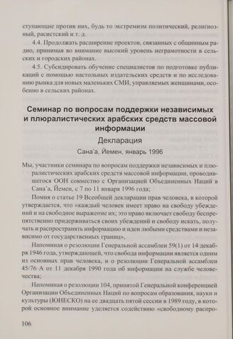 Семинар по вопросам поддержки независимых и плюралистических арабских средств массовой информации. Декларация. Сана’а, Йемен, январь 1996