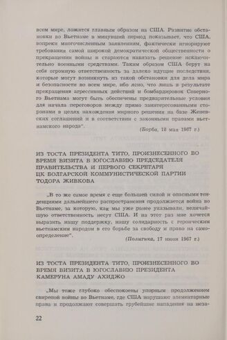 Президент Тито о вьетнамской проблеме с 1954 по 1968 год. Из тоста президента Тито, произнесенного во время визита в Югославию председателя правительства и первого секретаря ЦК Болгарской коммунистической партии Тодора Живкова // Политика, 17 июня 1967 г.