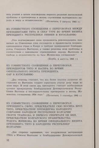 Из совместного сообщения о переговорах президентов Тито и Насера во время официального визита президента ОАР в Югославию // Политика, 5 сентября 1965 г.