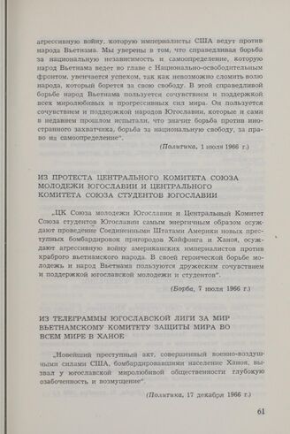 Из телеграммы Югославской лиги за мир Вьетнамскому комитету защиты мира во всем мире в Ханое // Политика, 17 декабря 1966 г.