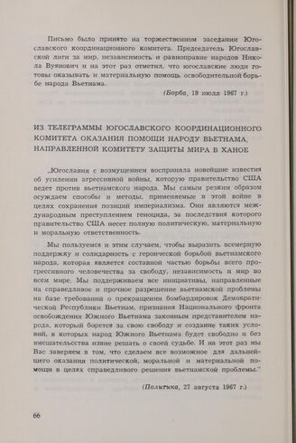 Из телеграммы Югославского координационного комитета оказания помощи народу Вьетнама, направленной Комитету защиты мира в Ханое // Политика, 27 августа 1967 г.