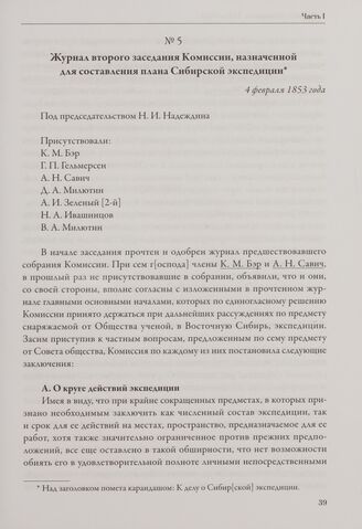 Журнал второго заседания Комиссии, назначенной для составления плана Сибирской экспедиции. 4 февраля 1853 года // НА РГО. Ф. 1-1850. Оп. 1. Д. 38. Ч. 1. Л. 395-424.