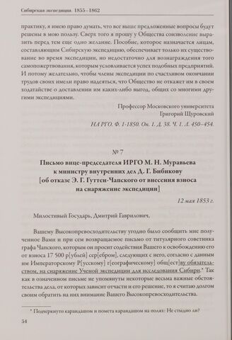 Письмо вице-председателя ИРГО М. Н. Муравьева к министру внутренних дел Д. Г. Бибикову [об отказе Э. Г. Гуттен-Чапского от внесения взноса на снаряжение экспедиции]. 12 мая 1853 г. // НА РГО. Ф. 1-1850. Оп. 1. Д. 38. Ч. 1. Л. 482-483.