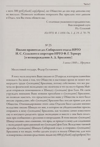 Письмо правителя дел Сибирского отдела ИРГО И. С. Сельского к секретарю ИРГО Ф. Г. Тернеру [о вознаграждении А. Д. Брылкину]. 3 июня 1860 г., Иркутск // НА РГО. Ф. 1-1858. Оп. 1. Д. 19. Л. 83-84.