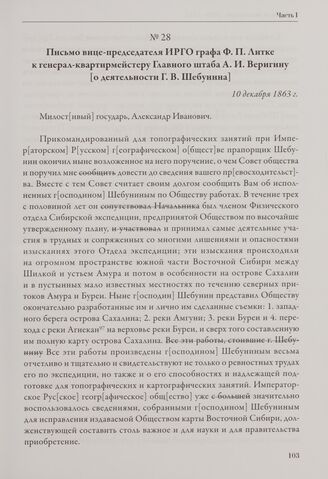 Письмо вице-председателя ИРГО графа Ф. П. Литке к генерал-квартирмейстеру Главного штаба А. И. Веригину [о деятельности Г. В. Шебунина]. 10 декабря 1863 г. // НА РГО. Ф. 1-1858. Оп. 1. Д. 19. Л. 308-310.