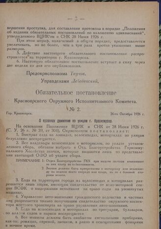 Обязательное постановление Красноярского Окружного Исполнительного Комитета. № 2. Гор. Красноярск. 26-го Октября 1926 г. О правилах движения по улицам г. Красноярска