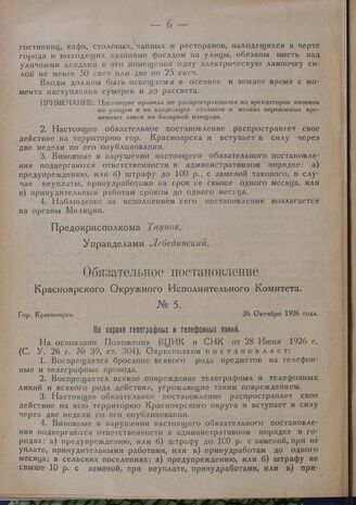Обязательное постановление Красноярского Окружного Исполнительного Комитета. № 5. Гор. Красноярск. 26 Октября 1926 года. По охране телеграфных и телефонных линий