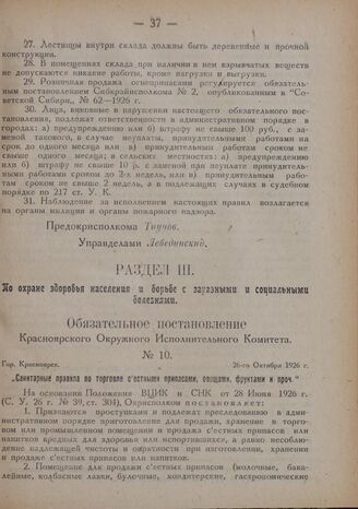 Обязательное постановление Красноярского Окружного Исполнительного Комитета. № 10. Гор. Красноярск. 26-го Октября 1926 г. „Санитарные правила по торговле съестными припасами, овощами, фруктами и проч."