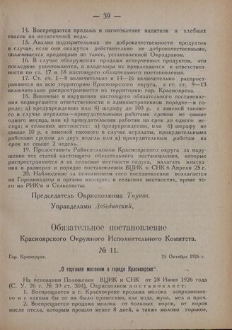 Обязательное постановление Красноярского Окружного Исполнительного Комитета. № 11. Гор. Красноярск. 26 Октября 1926 г. „О торговле молоком в городе Красноярске"
