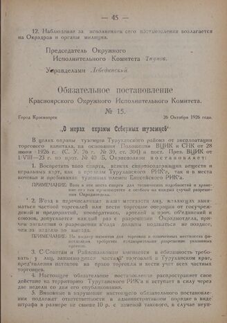 Обязательное постановление Красноярского Окружного Исполнительного Комитета. № 15. Город Красноярск. 26 Октября 1926 года. „О мерах охраны Северных туземцев"