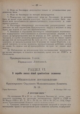 Обязательное постановление Красноярского Окружного Исполнительного Комитета. № 19. Город Красноярск. 26 Октября 1926 года. „О регистрации смерти“