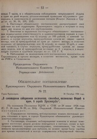 Обязательное постановление Красноярского Окружного Исполнительного Комитета. № 22. Город Красноярск. 26 Октября 1926 года. „О санитарном содержании гостиниц, столовых, постоялых дворов и проч. в городе Красноярске"