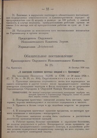 Обязательное постановление Красноярского Окружного Исполнительного Комитета. № 23. Гор. Красноярск. 26 Октября 1926 года. „О санитарном содержании прачечных заведений в г. Красноярске"