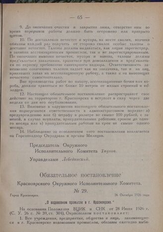 Обязательное постановление Красноярского Окружного Исполнительного Комитета. № 29. Город Красноярск. 26 Октября 1926 года. „О водовозном промысле в г. Красноярске"