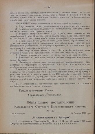 Обязательное постановление Красноярского Окружного Исполнительного Комитета. № 30. Гор. Красноярск. 26 Октября 1926 года.„Об извозном промысле в г. Красноярске"