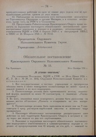 Обязательное постановление Красноярского Окружного Исполнительного Комитета. № 33. Гор. Красноярск. 26-го Октября 1926 г. „Об установке плевательниц”