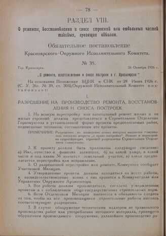 Обязательное постановление Красноярского Окружного Исполнительного Комитета. № 35. Гор. Красноярск. 26 Октября 1926 г. „О ремонте, восстановлении и сносе построек в г. Красноярске“
