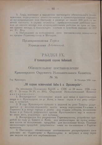 Обязательное постановление Красноярского Окружного Исполнительного Комитета. № 36. Гор. Красноярск. 26 Октября 1926 года. „Об охроне источников воды в г. Красноярске"