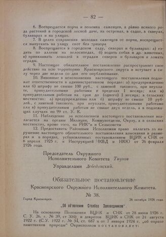 Обязательное постановление Красноярского Окружного Исполнительного Комитета. № 38. Город Красноярск. 26 октября 1926 года. „Об объявлении Столбов Заповедником"