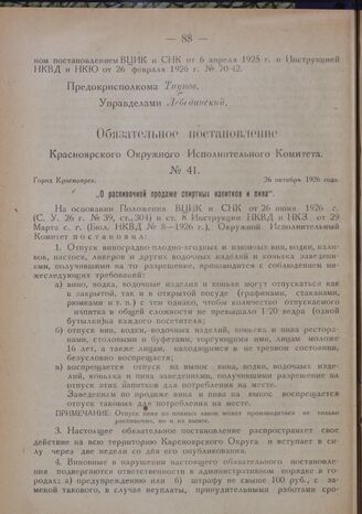Обязательное постановление Красноярского Окружного Исполнительного Комитета. № 41. Город Красноярск. 26 октября 1926 года. „О распивочной продаже спиртных напитков и пива“