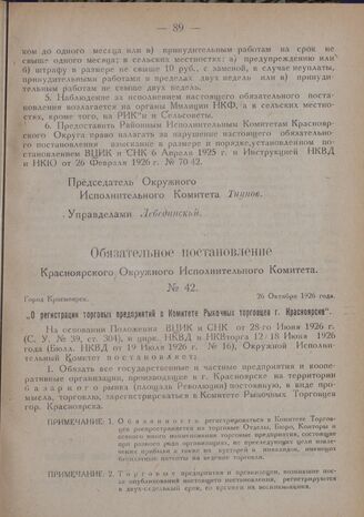 Обязательное постановление Красноярского Окружного Исполнительного Комитета. № 42. Город Красноярск. 26 Октября 1926 года. „О регистрации торговых предприятий в Комитете Рыночных торговцев г. Красноярска"