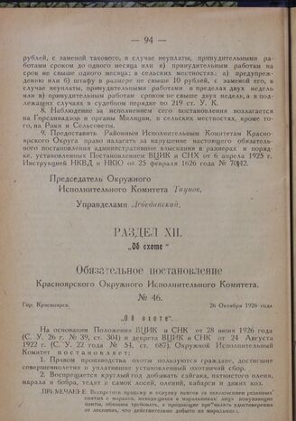 Обязательное постановление Красноярского Окружного Исполнительного Комитета. № 46. Гор. Красноярск. 26 Октября 1926 года. „Об охоте“