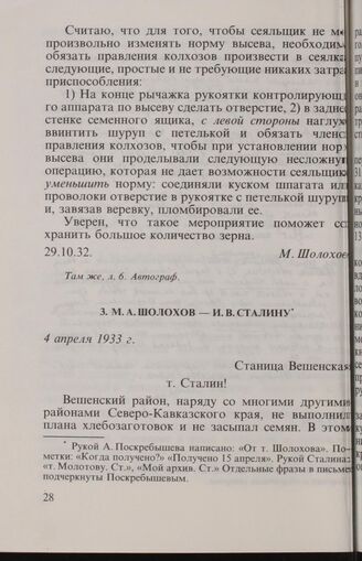 М. А. Шолохов — И. В. Сталину. 4 апреля 1933 г. // АП РФ, ф. 45, оп. 1, д. 827, л. 7—22. Подлинник.