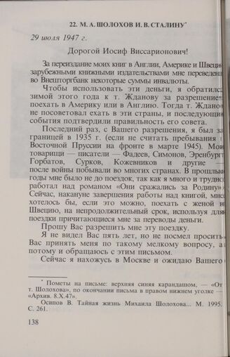 М. А. Шолохов И. В. Сталину. 29 июля 1947 г.