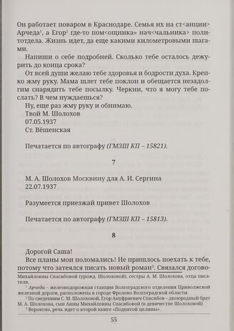 Письма М. А. Шолохова А. И. Сергину. М. А. Шолохов Москвину для А. И. Сергина. 22.07.1937 // Печатается по автографу (ГМЗШ КП - 15813).