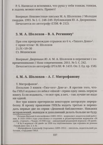 Неизвестные письма М. А. Шолохова // Молодая гвардия. 1993. № 2. С. 249. Публикация Ю. А. Дворяшина. (1) |