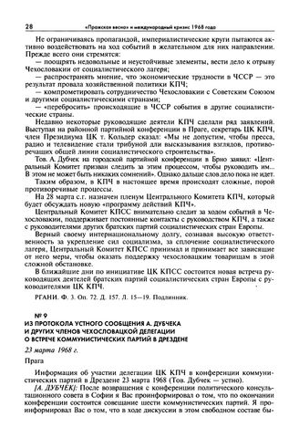 Из протокола устного сообщения А. Дубчека и других членов Чехословацкой делегации о встрече коммунистических партий в Дрездене. 23 марта 1968 г. // NA (бывший SÚA). A ÚV KSČ. F. 02/1. A.j. 74. S. 18. Типографский экз. Перевод с чешского.