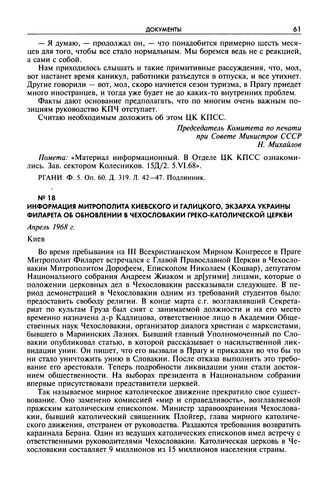 Информация митрополита Киевского и Галицкого, экзарха Украины Филарета об обновлении в Чехословакии Греко-католической церкви. Апрель 1968 г., Киев // ЦДАВО Украины. Ф. 4648. Оп. 5. Д. 115. Л. 20—22. Копия.