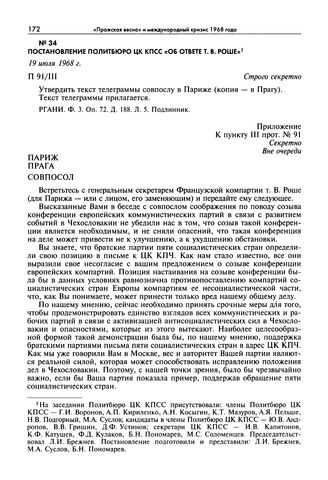 Постановление Политбюро ЦК КПСС «Об ответе т. В. Роше». 19 июля 1968 г. // РГАНИ. Ф. 3. Оп. 72. Д. 188. Л. 5, 14—15. Подлинник.