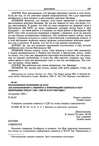 Постановление Политбюро ЦК КПСС «Об ознакомлении т. Ульбрихта с информацией совпосла в ЧССР (т[елегра]мма спец № 1384—1388 от 8.VIII.1968 года)». 10 августа 1968 г. // РГАНИ. Ф. 89. Оп. 76. Д. 73. Л. 1, 2. Выписка из протокола заседания.