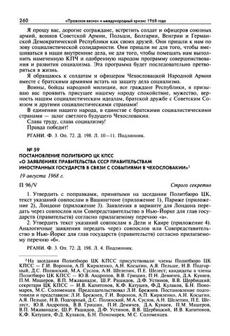 Постановление Политбюро ЦК КПСС «О заявлениях правительства СССР правительствам иностранных государств в связи с событиями в Чехословакии». 19 августа 1968 г. // РГАНИ. Ф. 3. Оп. 72. Д. 198. Л. 4, 20—21, 22—23, 24—25, 26—28, 29—30. Подлинник.