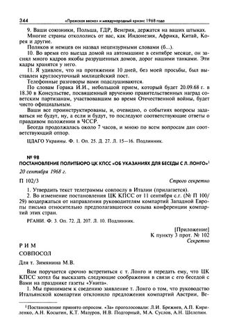 Постановление Политбюро ЦК КПСС «Об указаниях для беседы с Л. Лонго». 20 сентября 1968 г. // РГАНИ. Ф. 3. Оп. 72. Д. 207. Л. 10, 28—29. Подлинник.