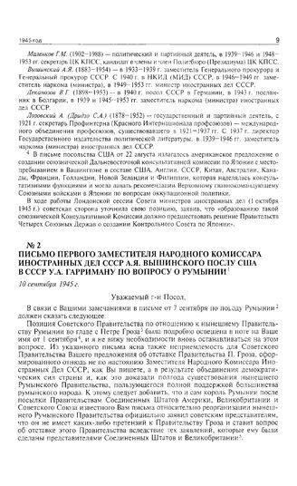 Письмо первого заместителя народного комиссара иностранных дел СССР А.Я. Вышинского послу США в СССР У.А. Гарриману по вопросу о Румынии. 10 сентября 1945 г. // АВП РФ. Ф. 06. Оп. 7. П. 46. Д. 375. Л. 118-119. Копия.