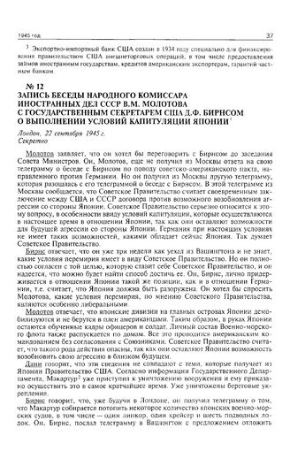 Запись беседы народного комиссара иностранных дел СССР В.М. Молотова с государственным секретарем США Д.Ф. Бирнсом о выполнении условий капитуляции Японии. Лондон, 22 сентября 1945 г.
