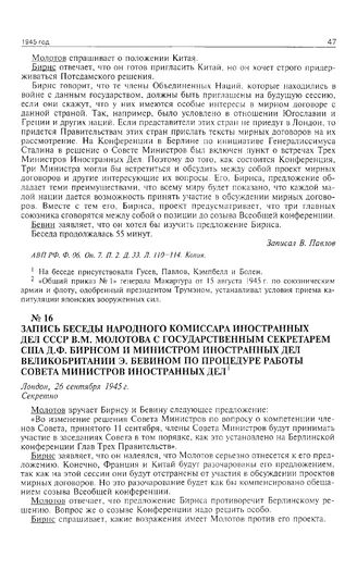 Запись беседы народного комиссара иностранных дел СССР В.М. Молотова с государственным секретарем США Д.Ф. Бирнсом и министром иностранных дел Великобритании Э. Бевином о процедуре работы Совета министров иностранных дел. Лондон, 26 сентября 1945 г. // АВЛ РФ. Ф. 06. Оп. 7. П. 2. Д. 33. Л. 122. Копия.