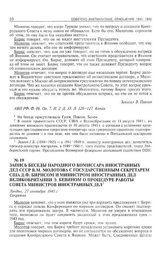 Запись беседы народного комиссара иностранных дел СССР В.М. Молотова с государственным секретарем США Д.Ф. Бирнсом и министром иностранных дел Великобритании Э. Бевином о процедуре работы Совета министров иностранных дел. Лондон, 27 сентября 1945 г. [2]