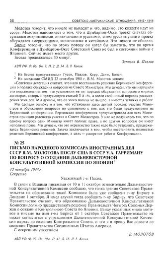 Письмо народного комиссара иностранных дел СССР В.М. Молотова послу США в СССР У.А. Гарриману по вопросу о создании Дальневосточной консультативной комиссии по Японии. 12 октября 1945 г.