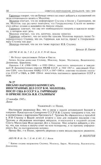 Письмо народного комиссара иностранных дел СССР В.М. Молотова послу США в СССР У.А. Гарриману о приеме посла И В. Сталиным. 15 октября 1945 г.