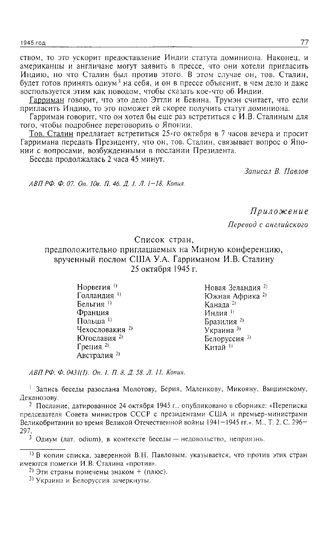 Приложение к записи беседы И.В. Сталина с послом США в СССР У.А. Гарриманом. Список стран, предположительно приглашаемых на Мирную конференцию, врученный послом США У.А. Гарриманом И.В. Сталину 25 октября 1945 г. // АВП РФ. Ф. 0431(1). Оп. 1. П. 8. Д. 58. Л. 11. Копия.