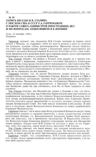 Запись беседы И.В. Сталина с послом США в СССР У.А. Гарриманом о работе Совета министров иностранных дел и по вопросам, относящимся к Японии. Сочи, 25 октября 1945 г. // АВП РФ. Ф. 07. Оп. 10в. П. 46. Д. 1. Л. 19-33. Копия.