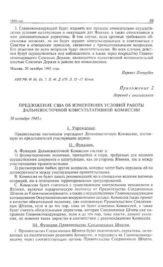 Приложение к записи беседы народного комиссара иностранных дел СССР В.М. Молотова с послом США в СССР У.А. Гарриманом. Предложение США об изменениях условий работы Дальневосточной консультативной комиссии. 30 октября 1945 г. // АВП РФ. Ф. 06. Оп. 7. П. 1. Д. 18. Л. 57-59.
