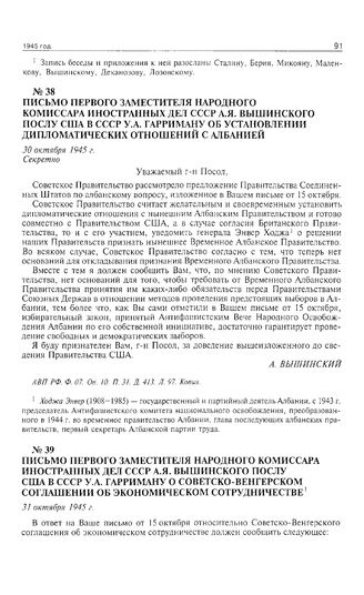 Письмо первого заместителя народного комиссара иностранных дел СССР А.Я. Вышинского послу США в СССР У.А. Гарриману о Советско-венгерском соглашении об экономическом сотрудничестве. 31 октября 1945 г. // АВП РФ. Ф. 07. Оп. 10. П. 31. Д. 413. Л. 100-101. Копия.