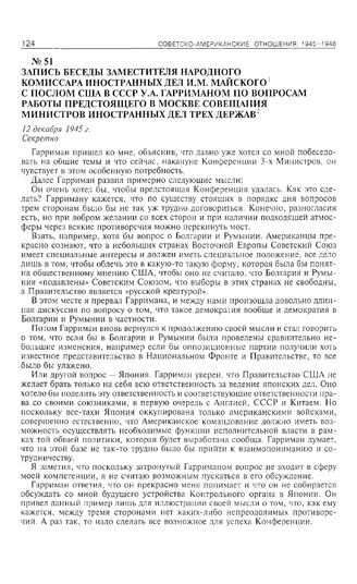 Запись беседы заместителя народного комиссара иностранных дел И.М. Майского с послом США в СССР У.А. Гарриманом по вопросам работы предстоящего в Москве Совещания министров иностранных дел трех держав. 12 декабря 1945 г. // АВП РФ. Ф. 06. Оп. 7. П. 5. Д. 51. Л. 65-70. Подлинник.