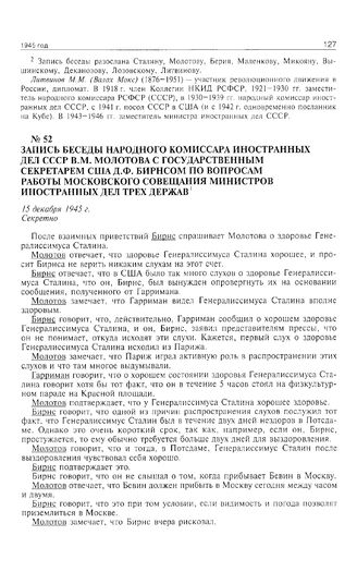 Запись беседы народного комиссара иностранных дел СССР В.М. Молотова с государственным секретарем США Д. Бирнсом по вопросам работы Московского совещания министров иностранных дел трех держав. 15 декабря 1945 г. // АВП РФ. Ф. 06. Оп. 7. П. 3. Д. 36. Л. 74-78.