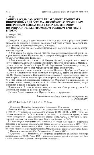 Запись беседы заместителя народного комиссара иностранных дел СССР С.А. Лозовского с временным поверенным в делах США в СССР Д.Ф. Кеннаном по вопросу о Международном военном трибунале в Токио. 12 января 1946 г. // АВП РФ. Ф. 018. Оп. 8. П. 1. Д. 7. Л. 16-17. Копия.