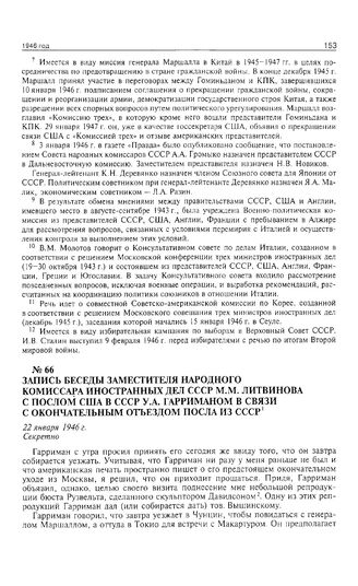 Запись беседы заместителя народного комиссара иностранных дел СССР М.М. Литвинова с послом США в СССР У.А. Гарриманом в связи с окончательным отъездом посла из СССР. 22 января 1946 г. // АВП РФ. Ф. 06. Оп. 8. П. 3. Д. 31. Л. 1-4. Подлинник.